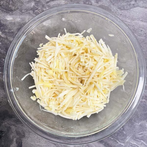 ・じゃがいもは皮をむき、包丁の刃元などを使い芽や傷などの汚れを除いて、3mm幅の千切りにする。(スライサーを使うと幅が均一で、焼きムラが出来ないためおすすめ)