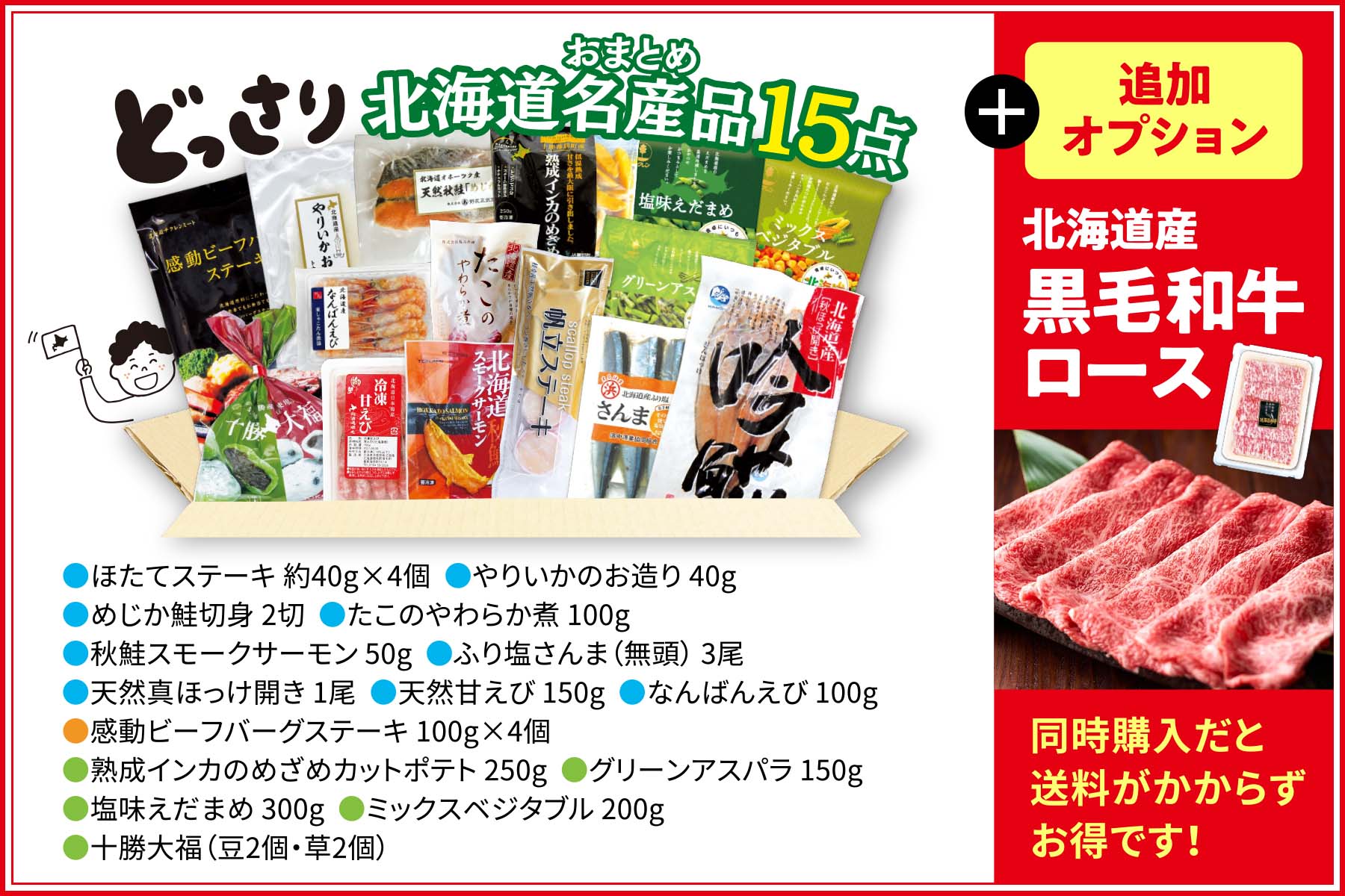 ●ほたてステーキ 約40g×4個 ●やりいかのお造り 40g ●めじか鮭切身 2切 ●たこのやわらか煮 100g ●秋鮭スモークサーモン 50g ●ふり塩さんま(無頭) 3尾 ●天然真ほっけ開き 1尾 ●天然甘えび 150g ●なんばんえび 100g ●感動ビーフバーグステーキ 100g×4個 ●熟成インカのめざめカットポテト 250g ●グリーンアスパラ 150g ●塩味えだまめ 300g ●ミックスベジタブル 200g ●十勝大福(豆2個・草2個) |