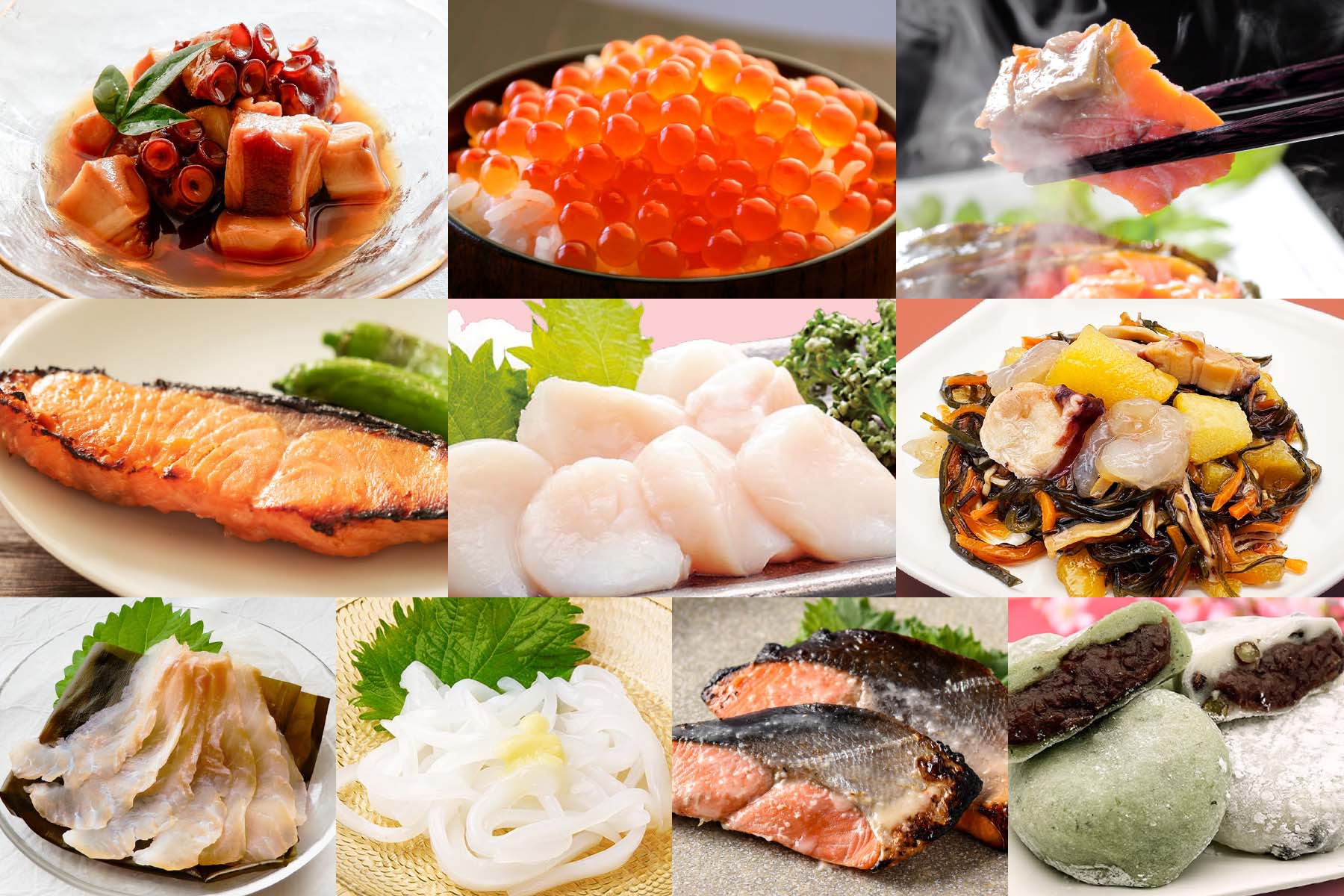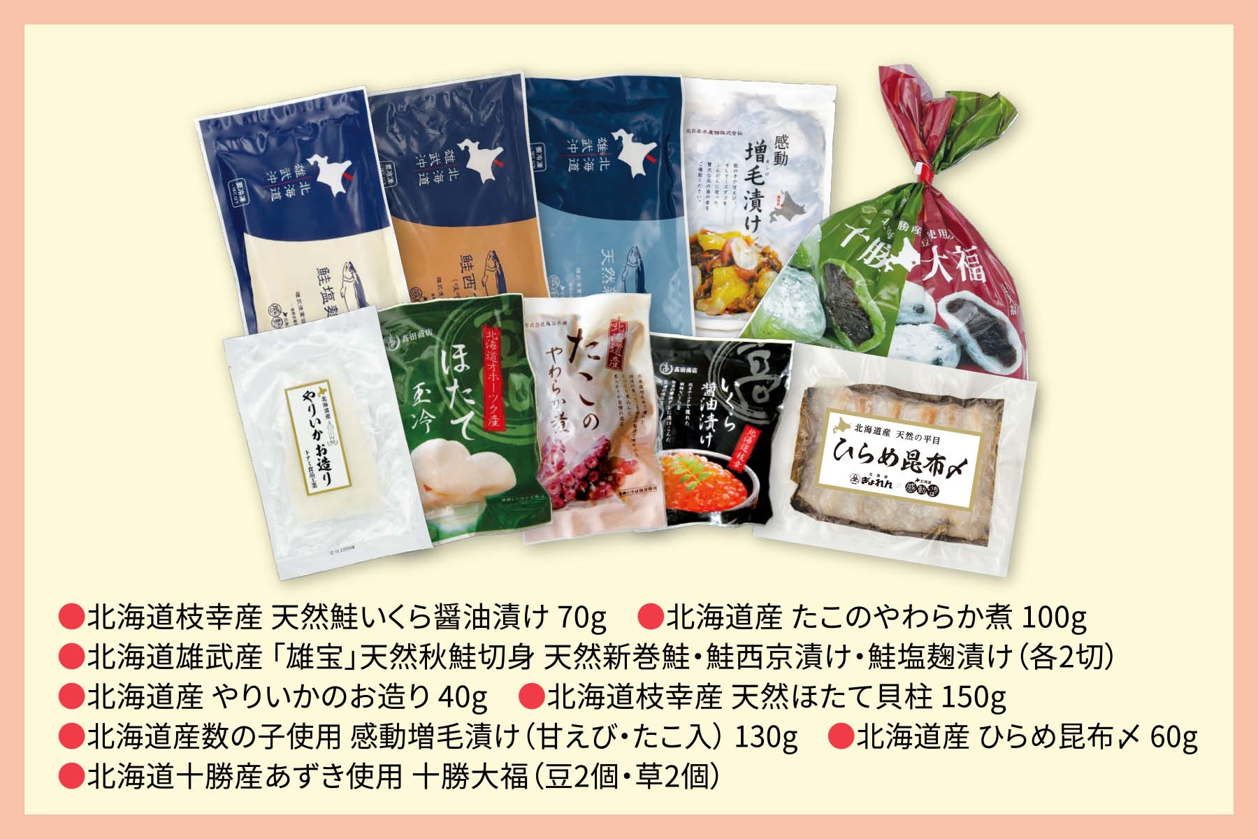 ●北海道枝幸産 天然鮭いくら醤油漬け 70g ●北海道雄武産 「雄宝」天然秋鮭切身 天然新巻鮭(2切)〈要加熱〉 ●北海道雄武産 「雄宝」天然秋鮭切身 鮭西京漬け(2切)〈要加熱〉 ●北海道雄武産 「雄宝」天然秋鮭切身 鮭塩麹漬け(2切)〈要加熱〉 ●北海道産 たこのやわらか煮 100g ●北海道産 やりいかのお造り 40g ●北海道枝幸産 天然ほたて貝柱 150g ●北海道産 ひらめ昆布〆 60g ●北海道産数の子使用 感動増毛漬け(甘えび・たこ入) 130g ●北海道十勝産あずき使用 十勝大福(豆2個・草2個) |