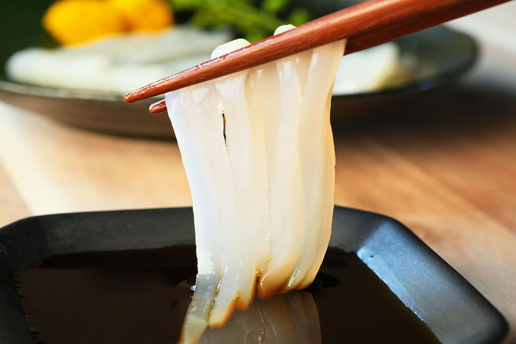 北海道産のやりいかは料亭でも使われる高級いか。くどさのない上品な甘みと、やわらかながら歯ごたえのある食感が魅力です。独自の裁断技術で丁寧にお造りにし、急速冷凍で鮮度を保持。解凍するだけで本格的なお造りをお楽しみいただけます。