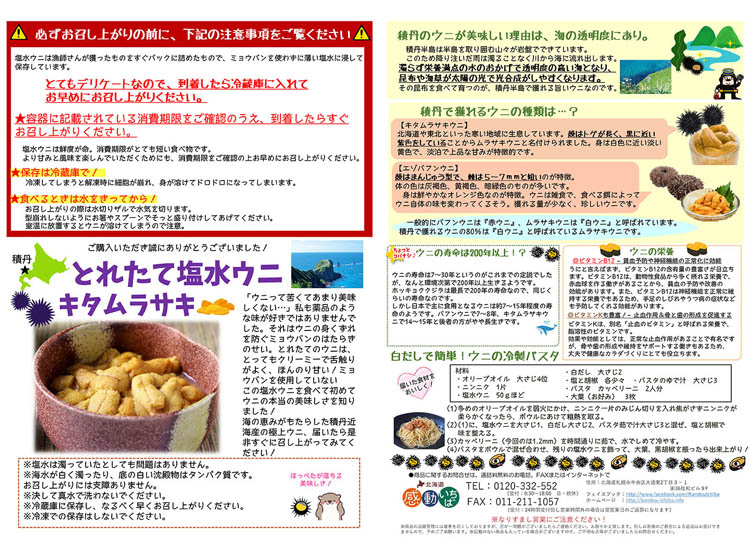 レシピ付きの食べ方ガイドも同封しますので、ぜひ参考にして積丹のキタムラサキウニをご堪能ください!